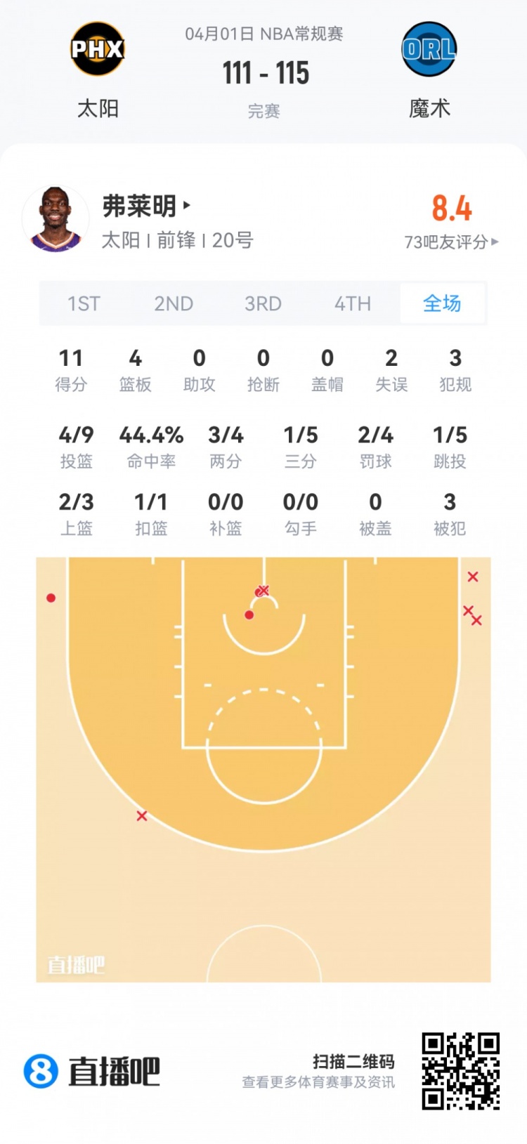 太阳次轮31号秀弗莱明 登场15.8分钟